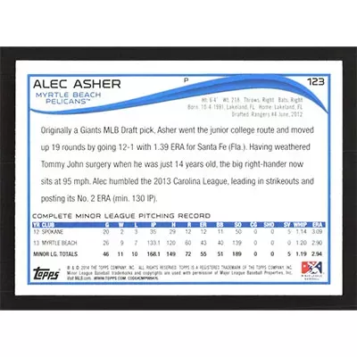 This is a 2014 Topps Pro Debut Alec Asher baseball card. The card is #123 and pictures show condition.