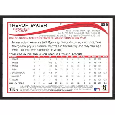 This is a 2014 Topps Red Foil Trevor Bauer baseball card. The card is #539 and pictures show condition.
