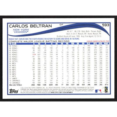 This is a 2014 Topps Red Foil Carlos Beltran baseball card. The card is #593 and pictures show condition.