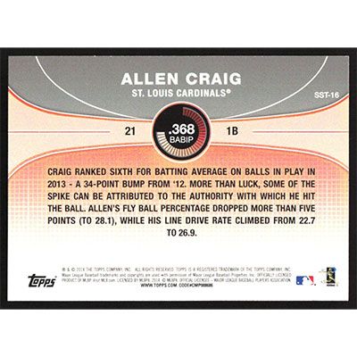 This is a 2014 Topps Saber Stars Allen Craig baseball card. The card is #SST-16 and pictures show condition.