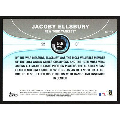 This is a 2014 Topps Saber Stars Jacoby Ellsbury baseball card. The card is #SST-17 and pictures show condition.