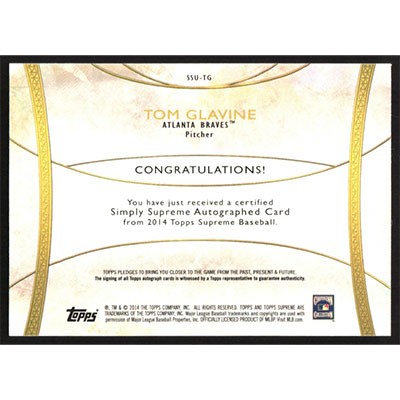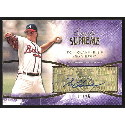 This is a 2014 Topps Supreme Simply Supreme Autographs Purple Tom Glavine autographed baseball card. This card has been signed, in blue, by Tom Glavine, and is certified authentic by Topps. The card is #SSU-TG and pictures show condition. This card is limited; #'d 11/25.