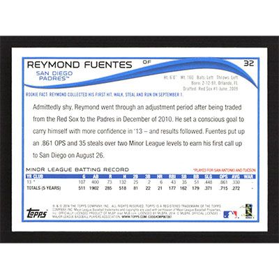 This is a 2014 Topps Target Red Reymond Fuentes baseball card. The card is #32 and pictures show condition. Team(s): San Diego Padres Rookie Card (RC)