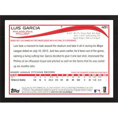 This is a 2014 Topps Target Red Luis Garcia baseball card. The card is #451 and pictures show condition. Team(s): Philadelphia Phillies Rookie Card (RC)