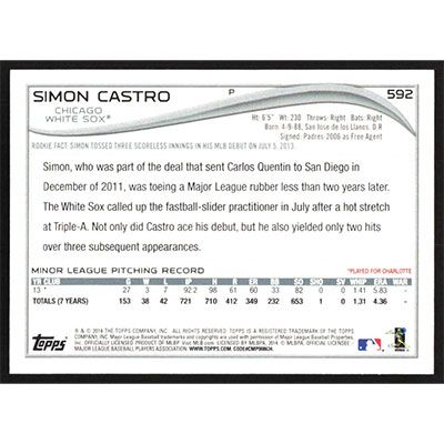 This is a 2014 Topps Target Red Simon Castro baseball card. The card is #592 and pictures show condition. Team(s): Chicago White Sox Rookie Card (RC)