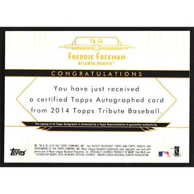 This is a 2014 Topps Tribute Autographs Sepia Freddie Freeman autographed baseball card. This card has been signed, in blue, by Freddie Freeman, and is certified authentic by Topps. The card is #TA-FF and pictures show condition. This card is limited; #'d 02/35.