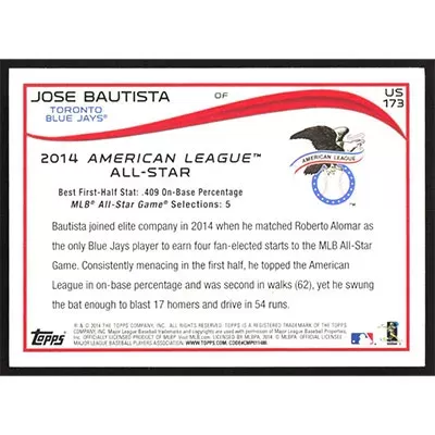 This is a 2014 Topps Update Jose Bautista baseball card. The card is #US-173 and pictures show condition.
