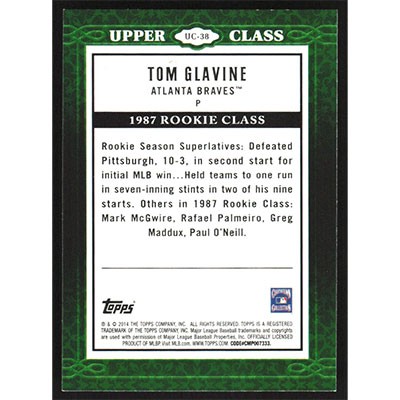 This is a 2014 Topps Upper Class Tom Glavine baseball card. The card is #UC-38 and pictures show condition.