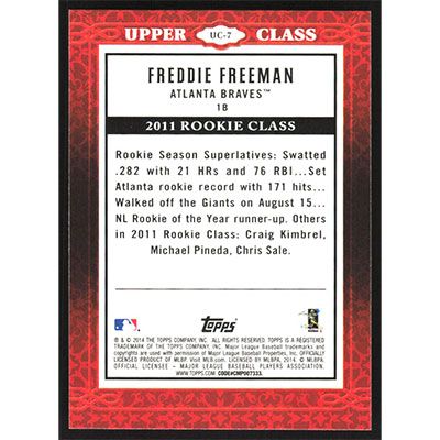 This is a 2014 Topps Upper Class Freddie Freeman baseball card. The card is #UC-7 and pictures show condition.