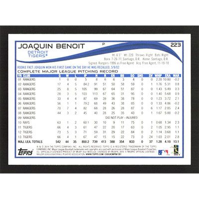 This is a 2014 Topps Wal-Mart Blue Joaquin Benoit baseball card. The card is #223 and pictures show condition.