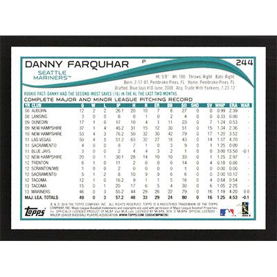 This is a 2014 Topps Wal-Mart Blue Danny Farquhar baseball card. The card is #244 and pictures show condition.