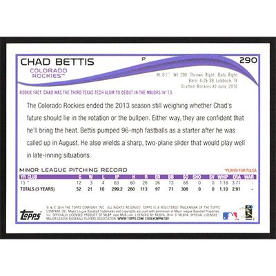 This is a 2014 Topps Wal-Mart Blue Chad Bettis baseball card. The card is #290 and pictures show condition. Team(s): Colorado Rockies Rookie Card (RC)
