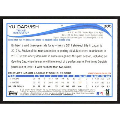This is a 2014 Topps Wal-Mart Blue Yu Darvish baseball card. The card is #300 and pictures show condition.