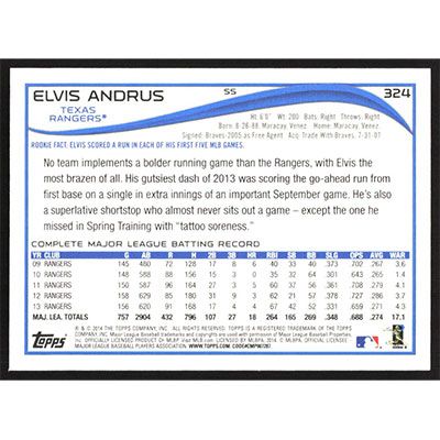 This is a 2014 Topps Wal-Mart Blue Elvis Andrus baseball card. The card is #324 and pictures show condition.