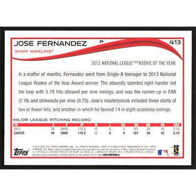 This is a 2014 Topps Wal-Mart Blue Jose Fernandez Award Winner baseball card. The card is #413 and pictures show condition.