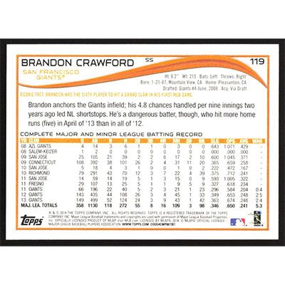 This is a 2014 Topps Yellow Brandon Crawford baseball card. The card is #119 and pictures show condition.