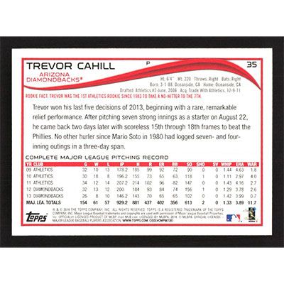 This is a 2014 Topps Yellow Trevor Cahill baseball card. The card is #35 and pictures show condition.