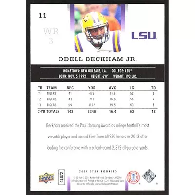 This is a 2014 Upper Deck Star Rookies Odell Beckham Jr. football card. The card is #11 and pictures show condition.