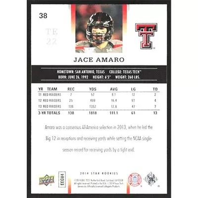 This is a 2014 Upper Deck Star Rookies Jace Amaro football card. The card is #38 and pictures show condition.