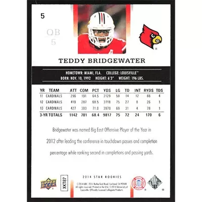 This is a 2014 Upper Deck Star Rookies Teddy Bridgewater football card. The card is #5 and pictures show condition. Team(s): Louisville Cardinals Rookie Card (RC)