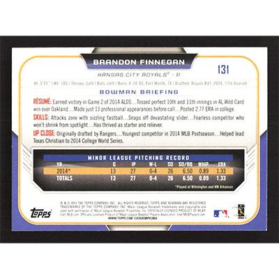 This is a 2015 Bowman Brandon Finnegan baseball card. The card is #131 and pictures show condition.