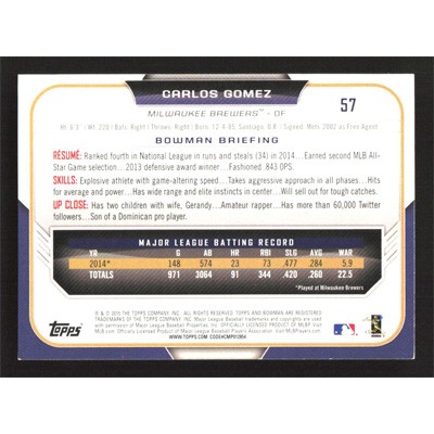 This is a 2015 Bowman Carlos Gomez baseball card. The card is #57 and pictures show condition.