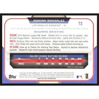This is a 2015 Bowman Adrian Gonzalez baseball card. The card is #73 and pictures show condition.