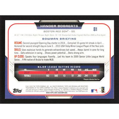 This is a 2015 Bowman Xander Bogaerts baseball card. The card is #81 and pictures show condition.