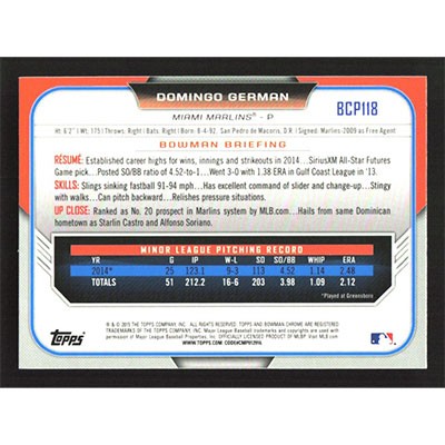This is a 2015 Bowman Chrome Prospects Domingo German baseball card. The card is #BCP118 and pictures show condition.