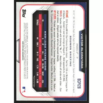 This is a 2015 Bowman Chrome Prospects Victor Alcantara baseball card. The card is #BCP128 and pictures show condition.