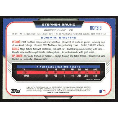 This is a 2015 Bowman Chrome Prospects Stephen Bruno baseball card. The card is #BCP219 and pictures show condition.