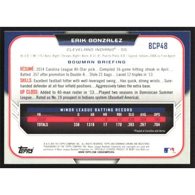 This is a 2015 Bowman Chrome Prospects Erik Gonzalez baseball card. The card is #BCP48 and pictures show condition.