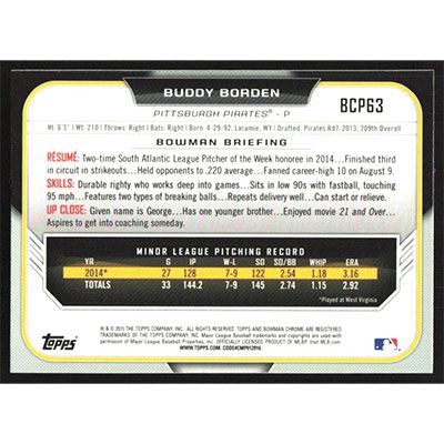 This is a 2015 Bowman Chrome Prospects Buddy Borden baseball card. The card is #BCP63 and pictures show condition.