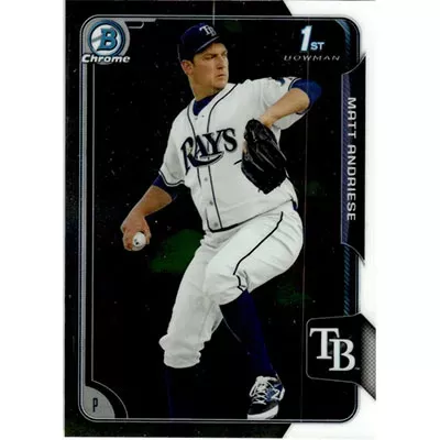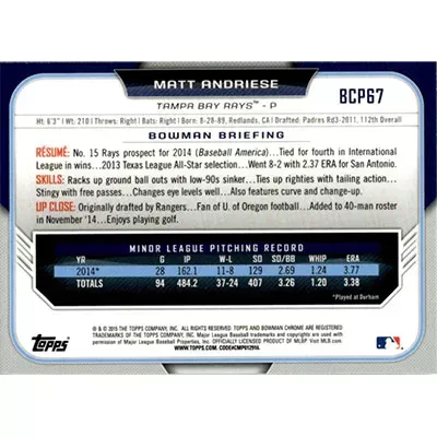 This is a 2015 Bowman Chrome Prospects Matt Andriese baseball card. The card is #BCP67 and pictures show condition.