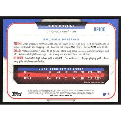 This is a 2015 Bowman Prospects Kris Bryant baseball card. The card is #BP100 and pictures show condition.
