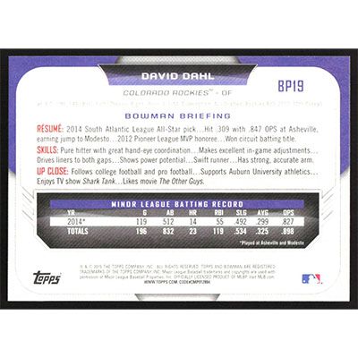 This is a 2015 Bowman Prospects David Dahl baseball card. The card is #BP19 and pictures show condition.
