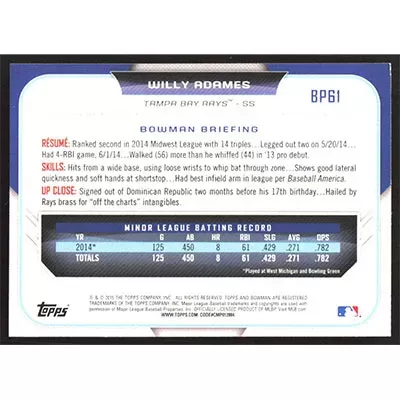 This is a 2015 Bowman Prospects Willy Adames baseball card. The card is #BP61 and pictures show condition.