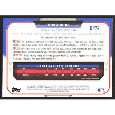 This is a 2015 Bowman Prospects Greg Bird baseball card. The card is #BP74 and pictures show condition.