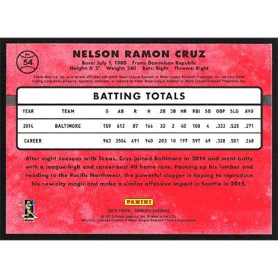 This is a 2015 Donruss Nelson Cruz baseball card. The card is #54 and pictures show condition.