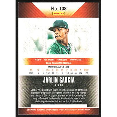 This is a 2015 Elite Extra Edition Jarlin Garcia baseball card. The card is #138 and pictures show condition.