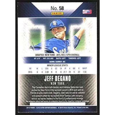 This is a 2015 Elite Extra Edition Jeff Degano baseball card. The card is #58 and pictures show condition.