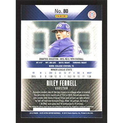 This is a 2015 Elite Extra Edition Riley Ferrell baseball card. The card is #80 and pictures show condition.