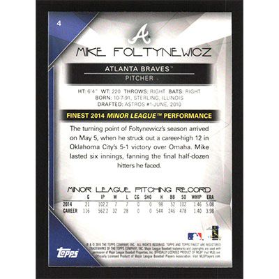 This is a 2015 Finest Mike Foltynewicz baseball card. The card is #4 and pictures show condition.