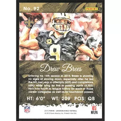 This is a 2015 Gridiron Kings Drew Brees football card. The card is #92 and pictures show condition.