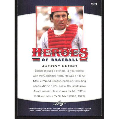This is a 2015 Leaf Heroes of Baseball Johnny Bench baseball card. The card is #33 and pictures show condition.