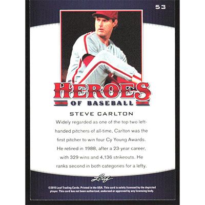 This is a 2015 Leaf Heroes of Baseball Steve Carlton baseball card. The card is #53 and pictures show condition.