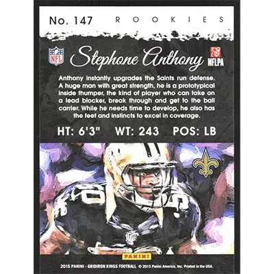This is a 2015 Panini Gridiron Kings Stephone Anthony football card. The card is #147 and pictures show condition.