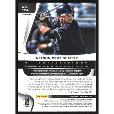 This is a 2015 Panini Prizm Red White and Blue Mojo Nelson Cruz baseball card. The card is #124 and pictures show condition.
