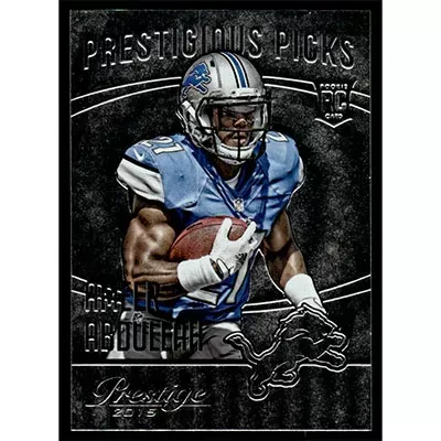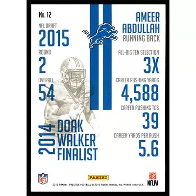 This is a 2015 Panini Prestige Prestigious Picks Ameer Abdullah football card. The card is #12 and pictures show condition. Team: Detroit Lions Rookie Card