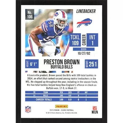 This is a 2015 Score Preston Brown football card. The card is #106 and pictures show condition.